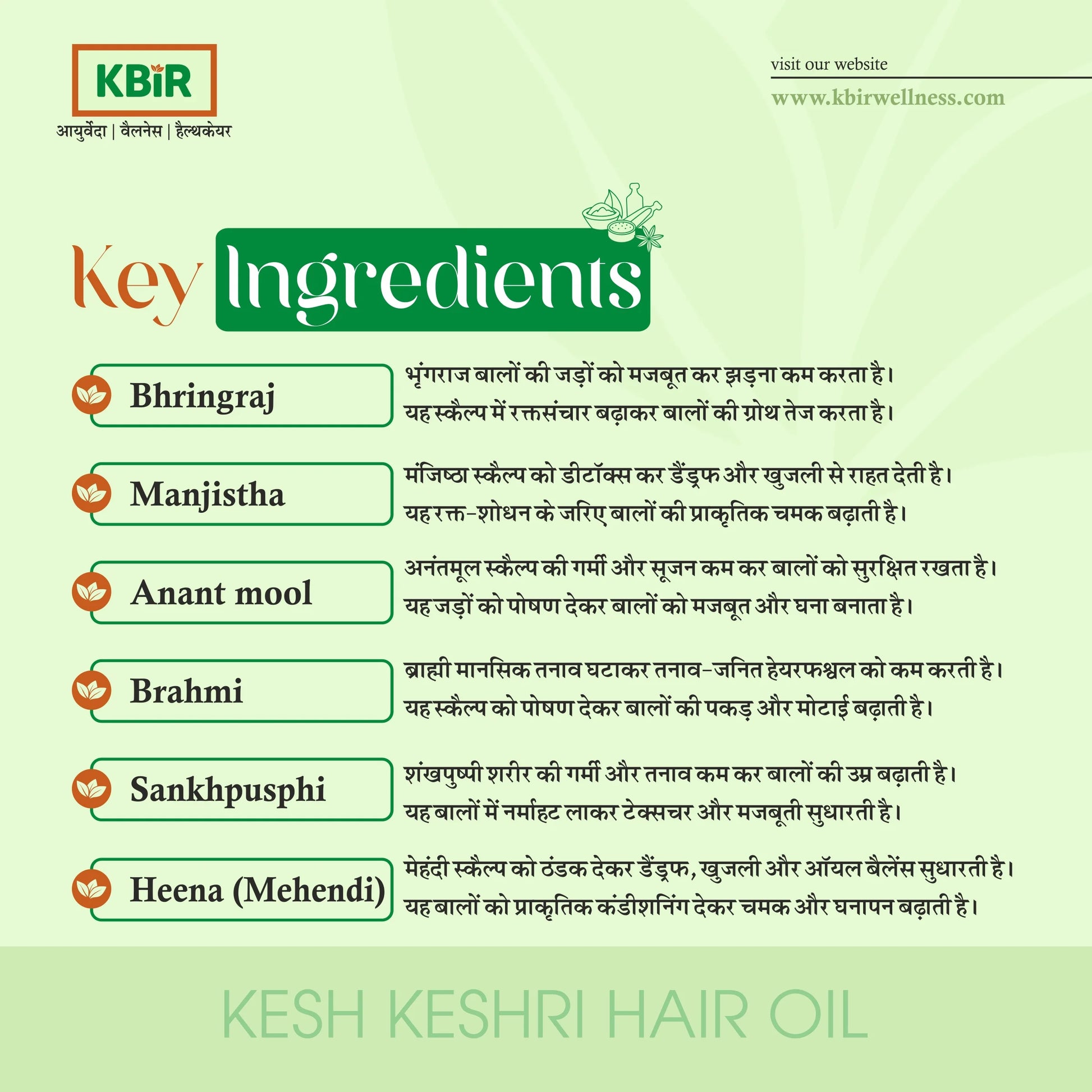 Each 20 ML Contains: Ghritkumari 3g, Brahmi 3g, Harar 2g, Bahera 1g, Amla 2g, Shikakai 2g, Bhringraj 4g, Jatamansi 2g, Kapoor Kachri 2g, Nagarmotha 4g, Shankhpushpi 4g, Neem 4g, Bakyan 100mg, Asusa 250mg, Daru Haldi 250mg, Tagar Ganth 200mg, Mulethi 500mg, Nagarmotha 300mg, Ratan Jyot 50mg, Chandan Oil 0.25ml, Til Oil 20ml