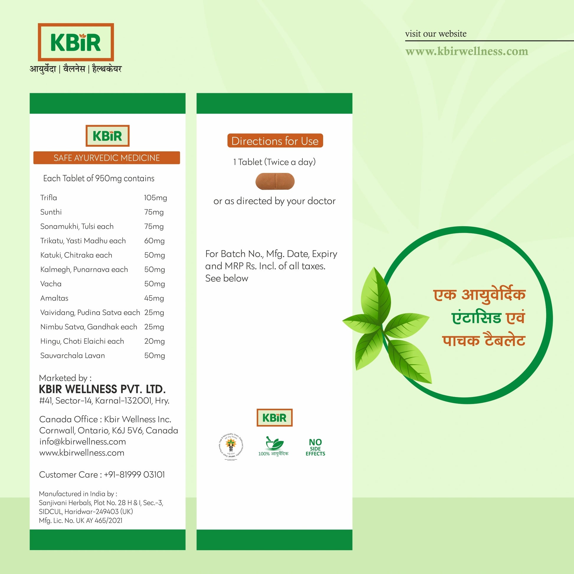 Each Tablet of 950mg contains: Trifla 105mg, Sunthi 75mg, Sonamukhi 75mg, Tulsi 75mg, Trikatu 60mg, Yasti Madhu 60mg, Katuki 50mg, Chitraka 50mg, Kalmegh 50mg, Punarnava 50mg, Vacha 50mg, Amaltas 45mg, Vaividang 25mg, Pudina Satva 25mg, Nimbu Satva 25mg, Gandhak 25mg, Hingu 20mg, Choti Elaichi 20mg, Sauvarchala Lavan 50mg.